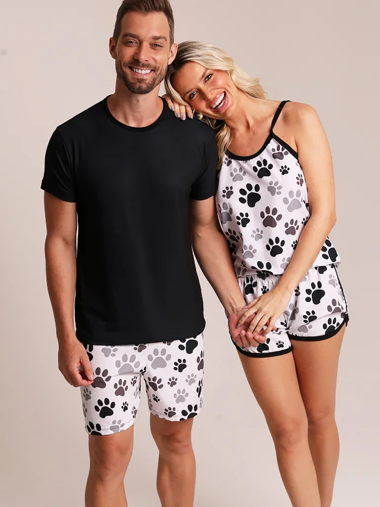 Casal Short Masculino + Short Doll Patinhas Preto e Branco