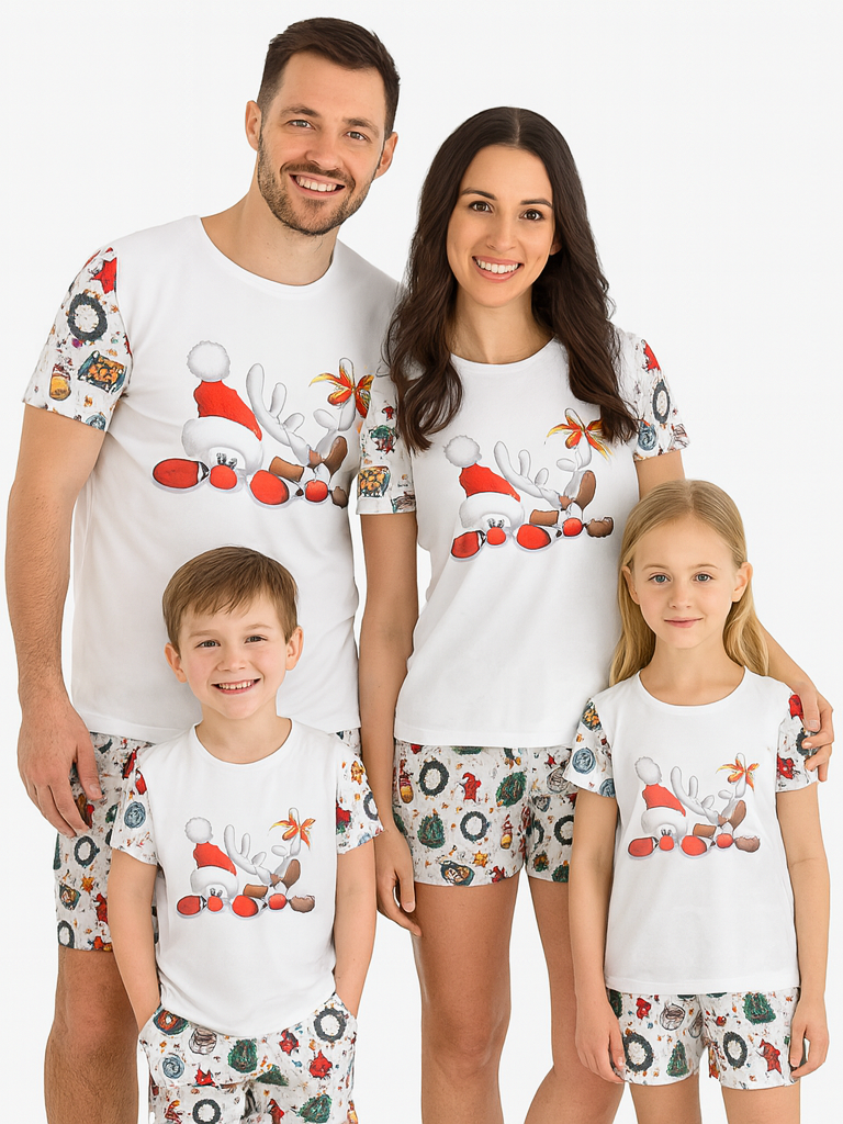 Produzidos em tecido macio, leve e confortável, os pijamas trazem estampa natalina clássica com renas, flocos de neve e pinheiros em vermelho, verde e branco. Perfeitos para viver momentos aconchegantes em família, registrar fotos inesquecíveis e entrar no clima natalino com muito estilo.