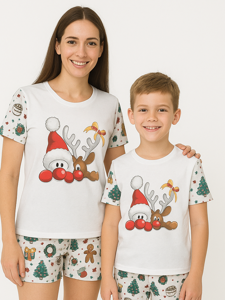 Produzidos em tecido macio, leve e confortável, os pijamas trazem estampa natalina clássica com renas, flocos de neve e pinheiros em vermelho, verde e branco. Perfeitos para viver momentos aconchegantes em família, registrar fotos inesquecíveis e entrar no clima natalino com muito estilo.
