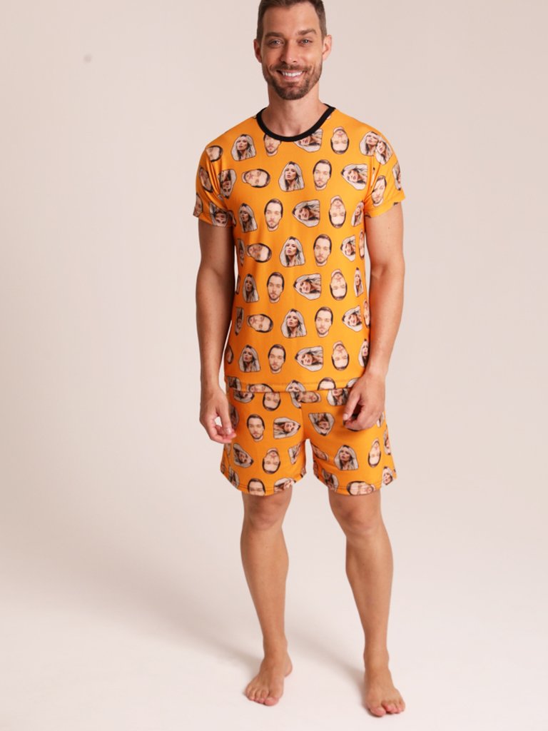 43 pijama casal personalizado com foto curto laranja